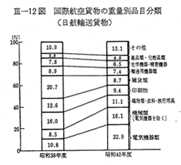 つぎに,貨物の品目別内訳をみると,電気機器類を含めて機械類が最も多く,次いで織物類・衣料・旅行用具・印刷物・雑貨類が比較的高い割合を占めている。機械類は航空機材の技術革新,特定大口割引運賃の導入等により雑貨類,織物類・衣料・旅行用具に代わつて最近急速に航空輸送の対象貨物として比重を高めてきたものであり( 〔III−12図〕),これからも国際貨物輸送における最近の航空選好の高まりをうかがうことができる。