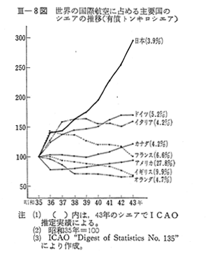 しかし,わが国のシエアは,現在アメリカ,イギリス,フランスはもちろん,第2次大戦後ほぼ同時期に国際航空に進出したドイツにも遠く及ばない状況にある。わが国が米州や欧州と東南アジアとの関門に位置し,国際航空路において枢要な地位を占めていること,わが国経済の高度成長に伴い他国との交流が政治,経済,文化等各方面にわたつてますます活発化していることなどを考慮すると,現在のシエアはまだまだ低く,今後いつそうその向上に努める必要があろう。