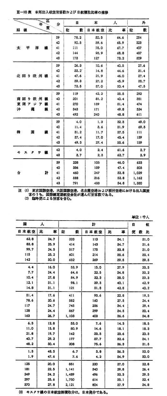 つぎに,わが国に出入した航空旅客について日本航空(株)の積取比率をみると 〔III−10表〕のとおり43年度は37.9%で前年度と比べて2.8ポイントの向上であつた。これは同社の便数比34.8%を上回るものである。これを日本人,外国人別にみると,日本人は54.8%,外国人は27.8%であり,いずれも前年度より向上している。