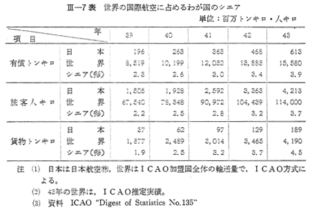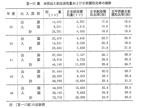 また,わが国に出入した航空貨物について日本航空(株)の積取比率をみると, 〔III−11表〕のとおり43年度には太平洋線の積取比率が著しく向上したため,全体でも32.9%と前年度より3.5ポイントの向上となつた。