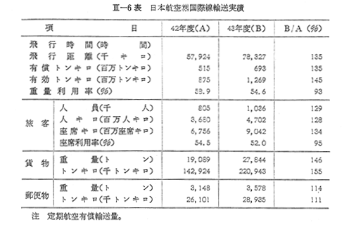 43年度の日本航空(株)国際線の輸送実績をみると 〔III−6表〕のとおり旅客輸送,貨物輸送,郵便物輸送いずれも着実に伸びており,とくに貨物輸送は好調であつた。この結果,有償トンキロは,6億9,300万トンキロと前年度比35%の増加となり,前年度の伸び率25%を大幅に上回つた。
