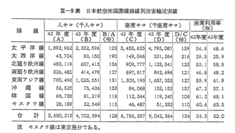 また,42年3月から運航開始された大西洋線は,ニューヨーク――パリ線の開設により人キロはほぼ倍増した。しかし,座席キロがこれを上回る伸びとなつたため,座席利用率では前年度を下回る結果となり,相変らず低調であつた。大西洋線は世界で最も競争の激しい路線であるだけに,座席利用率の向上を図るには格段の努力が必要であろう。
