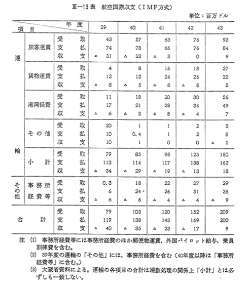 昭和43年度のわが国の航空国際収支は,著しい改善を示し,初の黒字計上を達成した。すなわち, 〔III−13表〕のとおり43年度の受取は前年度対比5,700万ドル増の2億900万ドルとなつたのに対し,支払は3,100万ドル増の2億ドルにとどまり,この結果収支尻では,2,600万ドルの改善をみて900万ドルの黒字となつた。航空国際収支は,従来から赤字幅縮少の基調をとつてきたが,43年度にいつきよに黒字計上となつたのは,路線網および便数の拡充,貨物専用便の運航等国際競争力の強化につとめた結果,旅客運賃収支の黒字幅が拡大し,また貨物運賃収支が著しく改善されたこと,港湾経費受取が大幅に増加したことによるものである。