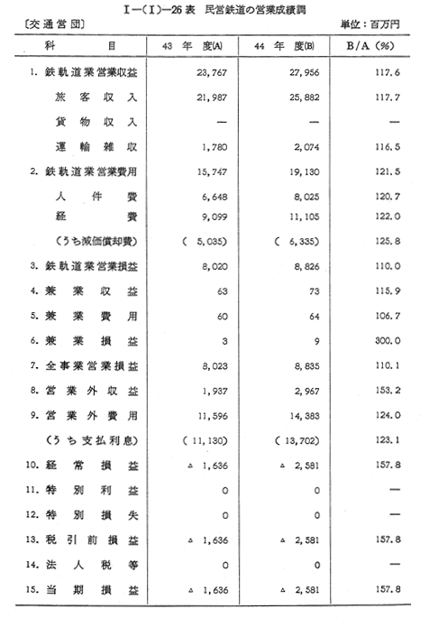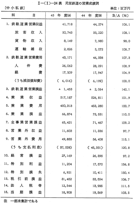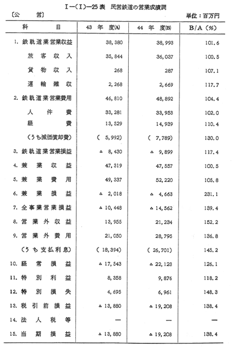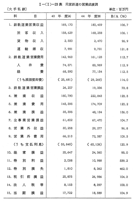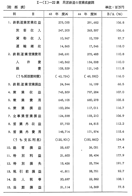 民営鉄道の44年度の営業成績は, 〔I−(I)−22表〕に示すとおりである。