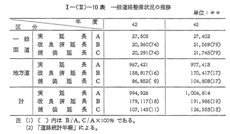 一般道路の43年度の整備状況は 〔I−(II)−10表〕のとおりであり,42年度と比較して,一般国道では改良済延長1,209キロ(6%),舗装延長1,452キロ(7%),地方道では改良済延長11,600キロ(7%),舗装延長17,955キロ(21%)それぞれ増加し,総延長では改良済延長12,869キロ(7%),舗装延長19,407キロ(18%)それぞれ増加している。