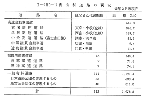 次に,有料道路として供用されているものは 〔I−(II)−11表〕のとおりであり,43年度と比較して,万国博覧会開催のための輸送力増強のため,高速自動車国道は23キロ(3%)伸びたほか,都市内高速道路46キロ(47%)と大幅に増加した。また,一般有料道路も126キロ(12%)の伸びを示した。