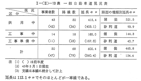 一般自動車道の現況は 〔I−(II)−13表〕のとおりであり,44年度末現在供用中のものは50路線総延長415.4キロ(前年度比3%増〉で工事中または工事準備中のものは18路線,総延長185.0キロ(前年度比18%増)である。