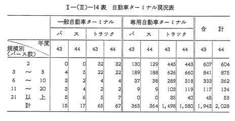 自動車輸送の合理化,効率化を図り,あわせて大都市の交通混雑の円滑化に資するため,自動車ターミナルの整備が進められており,その現況は 〔I−(II)−14表〕のとおりである。昭和44年度末,バスターミナル381,トラツクターミナル1,647であり,43年度に比してバスターミナルは1,トラツクターミナルは84増加した。バスターミナル,トラックターミナルはともに専用ターミナルが大部分を占めており,その規模は依然として5バース以下の小規模のものが多く,全体の72.9%を占めている。
