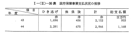 保障事業は,すべての自動車から徴収する賦課金を財源としており,損害てん補の基準等は責任保険の場合と同様である。昭和44年度に支払われた保障金は,死亡者265人に対し6億9,194万円,平均支払額261万円,負傷者2,701人に対し4億7,558万円,平均支払額17.6万円となつており,最近2年間におけるひき逃げ,無保険別の支払状況は, 〔I−(II)−36表〕のとおりである。