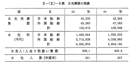 第3節 水先制度44年度末における我が国の水先区は30区であつて,そのうち水先法第13条に基づく強制水先区は,横浜,横須賀,神戸,関門,佐世保の5港となつている。 なお,現水先区以外の水域についても現在数港が水先区の候補地として検討されている。 水先業務の実績をみると 〔II−(II)−9表〕のとおり,44年において水先を行なつた船舶数は約10万9千隻で,これに対する水先料は58億4,400万円である。水先業務の実績は,出入港隻数の増大にともないここ数年着実に伸びており,近年特に外国船の増加が著るしい。この実績に対応して45年度には,20人程度の増員を行なつて水先業務のより円滑なる遂行を期している。
