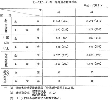 港湾運送量は,近年の経済成長に伴う流通貨物量の増加を反映して年々増加している。昭和44年の船内荷役量は,全国93港で3億7,950万トンに達し,対34年比で約2.5倍の増加となつている。