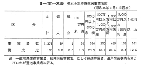 これらの港湾運送貨物を扱う港湾運送事業者(一般港湾運送事業者,船内荷役事業者,はしけ運送事業者,沿岸荷役事業者およびいかだ運送事業者)は,昭和45年3月末現在全国で1,273社である。これを港別累計でみると1,603社となる。これら事業者に対する港湾運送事業の免許数をみると, 〔II−(III)−22表〕のとおり全国93港で2,496で,その約56%が5大港に集中している。また港湾運送事業者の事業規模をみると,資本金5,000万円未満のものが全体の79%を占め,資本金5,000万円以上のものは21%にしかすぎず,近年事業規模の拡大が図られてきているものの,依然として零細な規模の事業者が多い 〔II−(III)−23表〕。