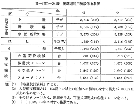 港湾運送用施設の保有状況は 〔II−(III)−24表〕のとおりであり,荷さばき場,荷役機械等の港湾運送用施設は港湾運送用貨物の増加につれて,ほぼ順調な増加を示している。このうち荷役機械については,近年軌道走行式,可搬式,固定式の各種クレーンが減少する傾向にあり,反面,能率のよい大型荷役機械,フオークリフト等が増加しつつある。