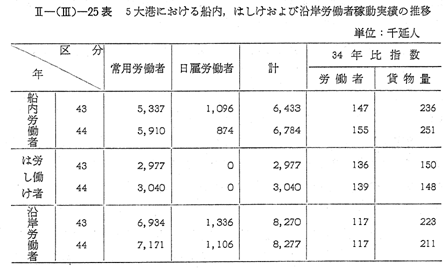 また,港湾運送は需要の波動性が大きいため,はしけ部門を除けばかなりの比率で日雇労働者に依存してきたが,41年以降,その常用化が急速に進んでおり,船内部門における日雇依存率は34年の54%から44年には13%へと大巾に改善されている 〔II−(III)−25表〕。