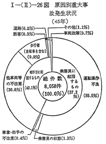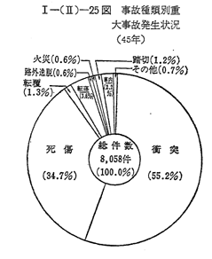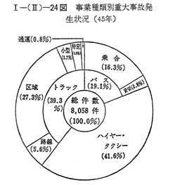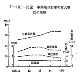 営業用自動車の重大事故(転覆,転落死者または重傷者を生りた事故等)の発生件数および被害件数は 〔I−(II)−23図〕のとおりである。45年中の事故件数は8,058件で前年に日比べ12.6%減少し,これに伴い負傷者数も5.2%減少している。しかし,死者数については,4.9%増加している。