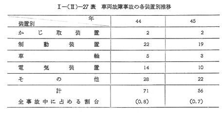 なお,車両事故は 〔I−(II)−27表〕のとおり全体の0.7%である。車両故障事故は逐年減少しているとはいうものの,安全確保土きわめて重要であるかじ取装置,制動装置の不良に起因するものが全体の3分の1を占めており,これらに対する点検整備等の強化を図る必要がある。
