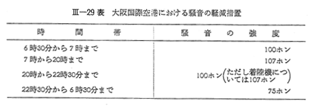 また,大阪国際空港については,45年2月には長さ3,000メートルのB滑走路の供用が開始され,空港周辺の住民におよぼす騒音が従来より大きくなるおそれがあるところから,上記の措置のほかに時間帯ごとに航空機騒音の最高限度を定めてその軽減措置をB滑走路の供用開始の日から講ずることとした。具体的な制限措置の内容は〔III一29表〕のとおりである。
