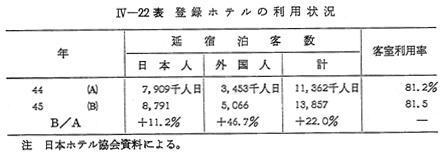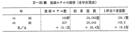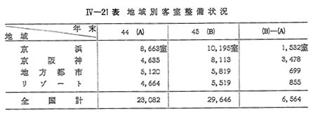 これを地域別にみると 〔IV−21表〕のとおり,京坂神地区がほぼ倍増しており,これは万国博の開催を契機にホテルが急速に整備されたためである。