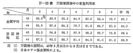 一方,客室利用率をみると,若干の増加に止まつているが,客室数が飛躍的に増大したことを考慮すると,特筆すべきことである。万国博開催中の客室利用率をみると 〔IV−23表〕のとおり,前年同期に比べて大幅に高くなつており,京阪神地区については,その傾向がとくに顕著である。
