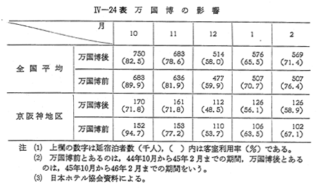 日本万国博覧会後の客室利用率の変化をみると 〔IV−24表〕のとおり,おしなべて低下してい乱しかし,これを延宿泊者数について比較すると各地区とも増加しており,利用率の低下は万国博を契機とする客室数の増加が,一時的に影響を与えたためと考えられる。