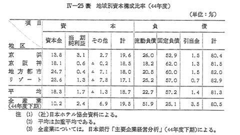ホテルの経営状況について,まず,その経営規模をみると,45年1月現在,資本金が5,000万円をこえる会社が,86.2%(43年末76.4%)となつており,大規模化が進んでいる。主要ホテルの資産構成率をみると,総資産のなかで固定資産の占める割合は86.7%と勉産業に比べ著しく高い。また,資構成比率は 〔IV−25表〕のとおりで,自己資本の占める割合は18.7%(43年末21.2%)である。