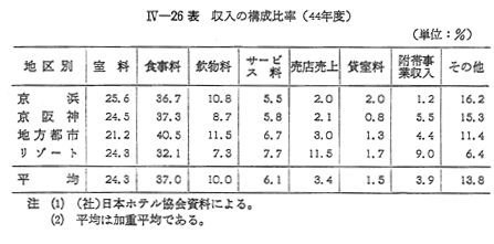 主要ホテルの取入状況をみると 〔IV−26表〕のとおりで,全国平均では食事料収入37.0%,室料収入24.3%,飲食料収入10.0%となつている。地区別にみるとリゾート地区は他地区に比較して付帯事業収入が9.0%と高い比率を示している。