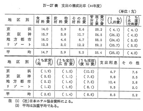 一方,支出面をみると 〔IV−27表〕のとおりで,全国平均では,管理費および営業費58.4%,食事材料費14.7%が主なものであり,そのうち人件費の占める割合は25.5%,また,支払利息が8.5%となつている。