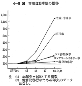 (2) 自動車輸送においても特種用途車の開発が進められ,<参fig4-8>にみるように専用自動車は,一般貨物車に比べ高い伸びを示している。