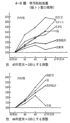 輸入貨物の大宗を占める原油,鉄鉱石及び石炭,並びに内航の石灰石,セメント,石油等基幹産業向け大量輸送を受けもつ海運では 〔4−9図〕に示すように専用化と大型化が進められている。