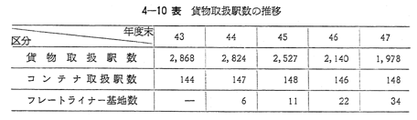 国鉄では,貨物輸送近代化のため 〔4−10表〕にみるように網羅的輸送体制から拠点駅を中心とする集約的,直行輸送方式に転換しつつあり,鉄道のもつ大量輸送のメリツトを打ち出している。