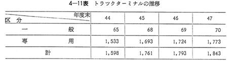 トラツク輸送の合理化,効率化を図り,あわせて道路交通の円滑化に資するため,全国に1,843(48年3月)のトラツクターミナルが設置され,その整備状況は 〔4−11表〕のとおりである。