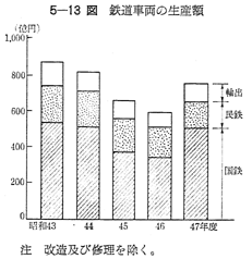 鉄道車両の生産額(改造及び修理は除く)は 〔5−13図〕のように43年度をピークに減少を続けてきたが,47年度は749億円で,前年度に比べて27.0%増と4年振りに前年度を上回つた。これを需要先にみると国鉄向けは,513億円と前年度に比べて51.0%増となつた。内訳では,電気機関車,電車が中心で,特に電車の前年度比は155.8%増と飛躍的に増加した。民需向けは,143億円で19.8%減とその生産額は減少した。輸出向けは93億円と30%増となつた。