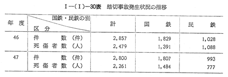 踏切事故の発生件数及び死傷者数の推移は 〔I−(I)−30表〕のとおりで,35,36年頃をピークとして,それ以降は,踏切の立体交差化,構造改良,保安設備の整備を行つた結果,減少を続けている。