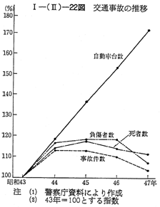 自動車保有台数の増加とともに増加してきた交通事故も,官民あげての事故防止に対する意識の高揚,交通規制の強化,道路環境の整備,自動車の安全基準の強化等の諸施策の効果が現われ始め,45年,46年を境に,交通事故件数,死者数,負傷者数とも減少の傾向を示している。 47年中に発生した交通事故の概要は,発生件数659,283件(前年比94.1%),死者数15,918人(前年比97.8%),負傷者数889,198人(前年比93.6%)であり,その推移は 〔I−(II)−22図〕のとおりである。