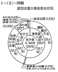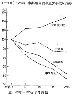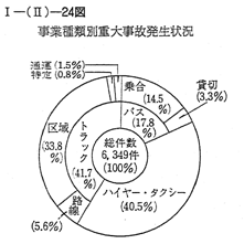 47年中の事故件数は,6,349件で前年に比べ14.7%減少している。 事故発生状況は,事業の種類別にみると 〔I−(II)−24図〕トラツク41.7%,ハイヤー・タクシー40.5%,バス17.8%となつており,また原因別にみると 〔I−(II)−25図〕,乗務員に起因するものが55.7%,相手方に起因するものが43.7%になつている。