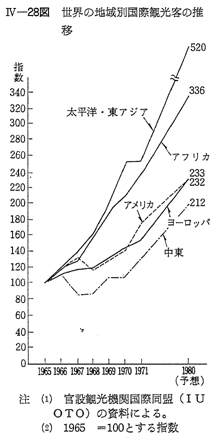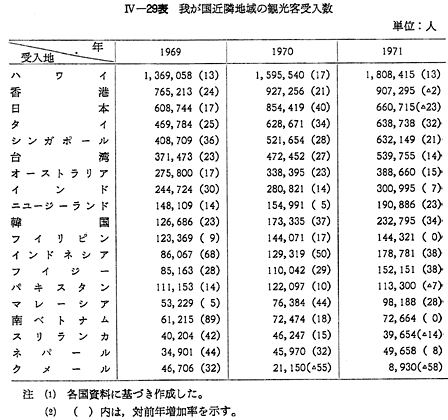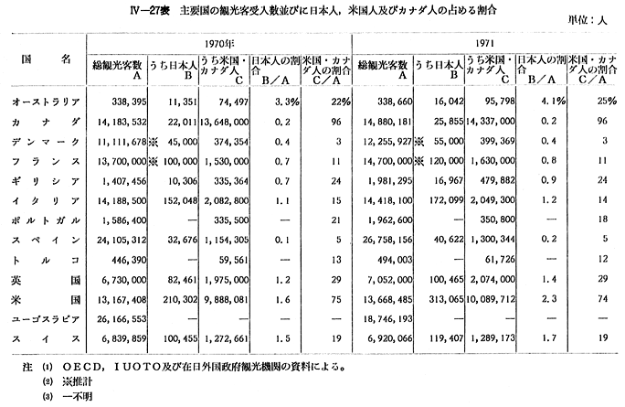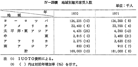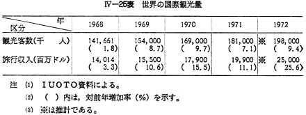 1 国際観光の一般的動向世界の国際観光は,観光客数及び旅行収入において,毎年その記録を更新して発展を続けている。官設観光機関国際同盟(IUOTO)の推計によると,1971年に世界各国が受け入れた観光客の合計は, 〔IV−25表〕のとおり,前年比7.1%増の1億8,100万人,旅行収入は11%増の199億ドルに達している。