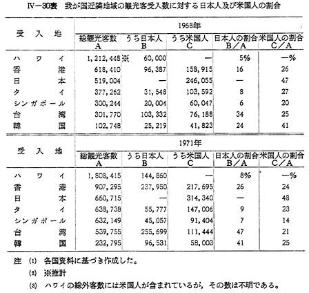 また,我が国の隣接国である韓国は,日本人客の増加により高い増加率を示している。この地域を訪れている主要観光客は 〔IV−30表〕のとおり米国人及び日本人である。米国人観光客は,日本,韓国,タイ及び香港において,主要な観光客であるが,その割合は多くの地域において年々減少している。一方,日本人観光客は,いずれの地域においてもその割合は増加しており,この地域における比重はますます大きくなりつつある。