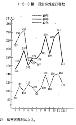 第3節 旅客輸送昭和48年の我が国への入国外客数は,78万5,000人で前年比8.4%増であったが,日本万国博覧会が開催された45年の入国外客数(85万4,000人)には達しなかった。入国外客数を目的別にみると,滞在客は68万8,000人で9.0%増,一時上陸客は9万6,000人で4.6%増を示した。滞在客のうち,観光客は45万人で6.9%増,業務その他客は23万8,000人で13.1%増であった。また,これを月別にみると10月が最も多く,9月,4月の順となっている。 入国外客を地域別にみると,北米からの入国者が36万3,000人で全体の46.2%を占め,次いでアジアが21万8,000人で27.8%,ヨーロッパが15万1,000人で19.2%,大洋州が3万1,000人で4.0%となっており,前年比では,ヨーロッパ,アジアがそれぞれ15.9%,13.8%の大幅増を示したのに対し,北米は2.2%増にとどまった。北米からの入国客数は,オリンピック東京大会のあった39年,日本万国博覧会のあった45年及び札幌オリンピック冬季大会のあった47年を除いて,いずれも入国外客数の50%を越えていたが,48年には前年に比べても更に2.8ポイント減少した。 49年に入ってからの外客入国状況は,石油危機や主要国の物価上昇を反映して伸びの減少がみられ,1〜6月の入国外客数は前年同期比1.8%増にとどまっている。 次に,48年の日本人の海外旅行者数は,228万9,000人で沖縄分を除くと前年比64.4%増となっており,44年から47年にみられた35〜45%を越える高い伸びを示した。 これを旅行目的別にみると,業務目的が38万1,000人で40.5%増にとどまったのに対し,観光その他目的は44年にはじめて業務を上回って以来急上昇を続け,48年には,181万8,000人で前年比75.7%増となり,全体の79.4%を占めるに至った。 海外旅行者を旅行先(第1目的地)別にみると,ハワイ,グアム等を含む米国が65万1,000人で最も多く,また香港,台湾,韓国へもそれぞれ35万人から40万人が訪れており,身近な海外旅行が普及したことを示している。しかし,49年度に入ってからは景気の低迷を反映して,海外旅行を手控える傾向がでてきている。 また,48年における海外旅行者の出国時期を月別にみると 〔1−2−6図〕のとおりであり,11月,8月,10月の順となっている。