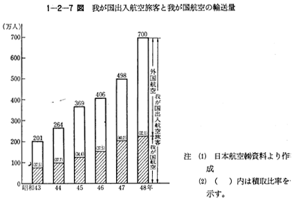 以上のように,我が国の国際旅行需要の伸びは著しいが,これら国際旅客輸送の大半を占める航空についてみると,48年の我が国の出入航空旅客数(通過客分を含む)は,699万9,000人で前年に比べ40.4%増を示し,前年の伸び率22.8%増を大きく上回った。我が国の航空会社の積取比率は輸送旅客数は225万人で前年に比べ12%増となったが前年の40.2%から32.1%に下落した 〔1−2−7図〕。