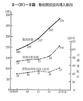 昭和25年の「外資に関する法律」制定以来,同法第10条に基づく船舶関係の甲種技術援助契約締結認可件数は,48年度までに507件(うち継続中のものは383件)となり,48年度における総認可件数は68件となっている。その内訳は原動機関係7件,補機関係5件,航海計器関係5件,海洋開発関係5件,安全・公害防止装置8件,ヨット・モーターボート関係8件,その他30件であり,安全・公害防止技術,海洋開発技術及びレジャー関係の技術の導入が増加している。また,47年度分の船舶関係の甲種技術援助契約に伴う対価支払い額は108億円(1ドル=308円換算)に達しており,前年度の82億円に対し32%増となっている 〔II−(IV)−8図〕。