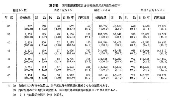 第3表 国内輸送機関別貨物輸送量及び輸送分担率