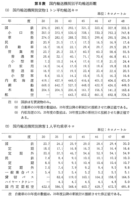 第8表 国内輸送機関別平均輸送距離