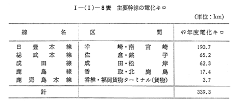電化工事については49年度に 〔I−(I)−8表〕のとおり完成した。この結果,49年度末の国鉄電位キロは,新線を含めて合計7,374.8km(前年度末6,961.4km)となり,電化率は34.9%(同33.0%)となった。