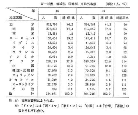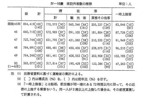 昭和49年における来訪外客数は, 〔IV−15表〕のとおり,76万4,000人,前年比2.6%の減少となった。これは,同年の世界の国際観光客受人数2.7%減とほぼみあう減少率である。来訪外客の内訳をみると,滞在客は前年比3.9%減の66万1,000人であり,一時上陸客は6.8%増の10万3,000人であった。滞在客のうち,観光の目的で来訪した外客数は前年比9.3%減の40万9000人,業務その他客は6.2%増の25万3,000人であった。