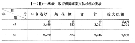 ひき逃げや無保険の自動車による事故の被害者については,上述の自動車損害賠償責任保険や自動車損害賠償責任共済による損害のてん補が行われないので,これを救済するために,運輸省は,自動車損害賠償保障事業を行っている。自動車損害賠償保障事業は,自動車損害賠償保障事業賦課金を財源として加害者にかわって損害のてん補を行い,その後加害者のわかっているものについては,加害者に求償する制度で,損害のてん補の限度額その他の運営はおおむね自動車損害賠償責任保険と同様である。保険金の支払状況は 〔I−(II)−25表〕のとおりである。
