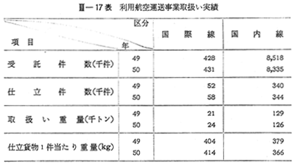 利用航空運送事業は,航空会社の貨物運賃の単位当たり賃率が重量逓減制であることを利用し,各荷主からは航空会社の賃率より低い賃率でその運送を引受け,これをまとめてさらに低い賃率の大口貨物に仕立て,自ら航空会社に対して荷主となって運送を委託し,荷主からの収受運賃と航空会社への支払運賃との差益を得ることを目的とする事業であって,航空貨物混載業とも呼ばれているものである。この事業を行っている者は,51年6月1日現在,国際線事業者が7社,国内線事業者が31社となっているが,これらの事業者の50年における貨物の取扱い実績をみると 〔III−17表〕のとおりであり,国際線については前年に比べ増加したが,国内線については前年に引続き減退した。