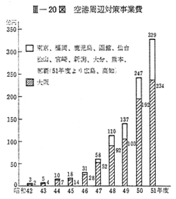 以上述べたとおり,空港周辺対策は年々拡充され,その予算も年々大幅な伸びを示し,51年度は前年度比33%増の329億円となっている 〔III−20図〕。