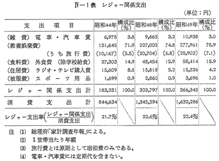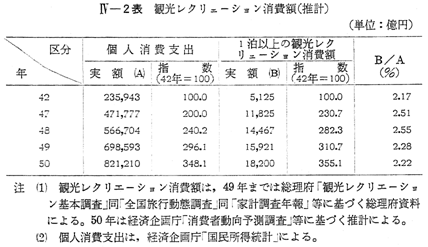 (1) レジャー関係支出昭和48年に至るまで実質国民所得は,順調に増加してきたが,49年には48年秋の石油危機に引き続いて起こった不況とインフレのために対前年比1.2%の減少となった。レジャー関係支出について見ると 〔IV−1表〕にあるように44年から48年までの5年間に,支出総額は66%,支出率は0.9ポイントの増加を示している。しかし,49年は,前年に比べて支出総額自体は21%増加しているものの支出率は0.2ポイント減少した。また1泊以上の観光レクリエーション消費額が個人消費支出中に占める割合は 〔IV−2表〕に見られるように,前年より0.27ポイント減少した。50年も前年に引き続いてわずかながら減少した。