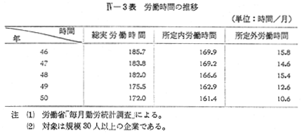 労働時間の短縮は毎年進んでおり,余暇時間は増加しつつある。労働省「毎月勤労統計調査」によると,月間労働時間については,50年は 〔IV−3表〕のとおり172.0時間で49年より3.5時間減少したが,これは,所定内 労働時間が毎年短縮しているのに加えて,経済状況は明るさを取り戻し始めたにもかかわらず,昨年に引き続き所定外労働時間が減少したためである。