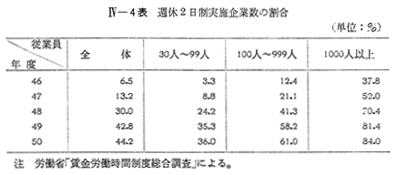 次に週休2日制の実施状況をみると, 〔IV−4表〕にあるように,週休2日制を採用する企業数の割合は,前年度の42.8%から50年度は44.2%へと1.4ポイント増加し,その適用労働者数の割合は,前年度より3.4ポイント増加して70.9%となった。内容をみても月1回制が全体の14.3%を占めてもっとも多いが,前年度よりは3.4ポイント減少しており,逆に月2回制は13.1%で前年度より1ポイントの増加,隔週制は9.9%で0.6ポイントの増加,月3回制は,2.3%で1ポイントの増加,完全週休2日制は4.6%で2.2ポイントの増加と向上しており,質量ともに充実しつつある。企業規模別では,大企業の実施比率が84.0%と高いが,中規模以下の企業の実施比率も高まってきている。